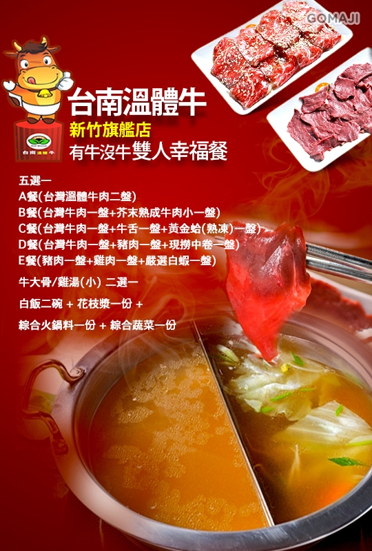 A餐(台灣溫體牛肉二盤)/B餐(台灣牛肉一盤+芥末熟成牛肉小一盤)/C餐(台灣牛肉一盤+牛舌一盤+黃金蛤(熟凍)一盤)/D餐(台灣牛肉一盤+豬肉一盤+現撈中卷一盤)/E餐(豬肉一盤+雞肉一盤+嚴選白蝦一盤) 五選一 + 牛大骨/雞湯(小) 二選一 + 白飯二碗 + 花枝漿一份 + 綜合火鍋料一份 + 綜合蔬菜一份